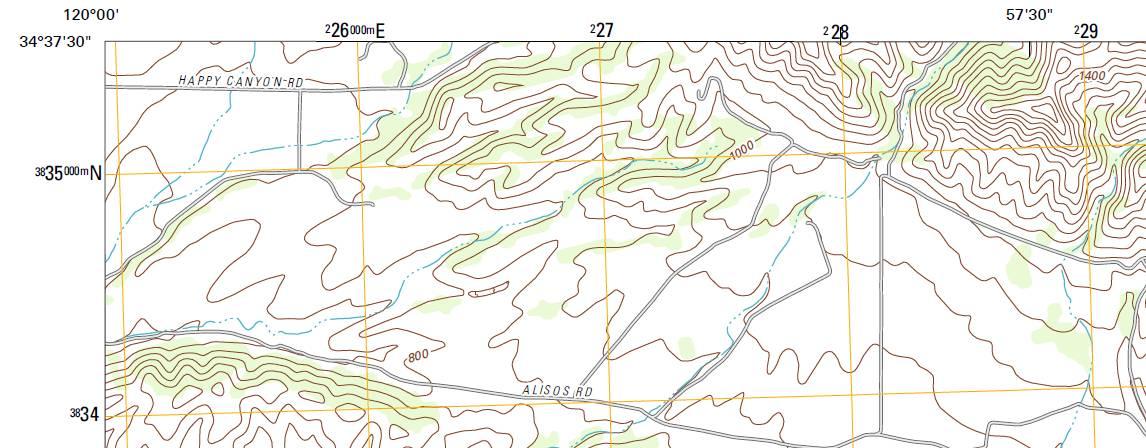 Test your newly learned gnowledge of UTM on this USGS topo extract. Click on it to view it at full size first. Note the UTM grid overlay in orange, and the graduation marks in the margin, both lat-long and UTM.