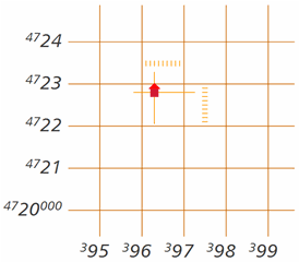 Also on the northings, the 4720 indicates that the y coordinate is 4,720 km from somewhere — the equator. The 396 on the easting similarly indicates that the x coordinate is 396 km from somewhere. Nowhere in particular, actually.